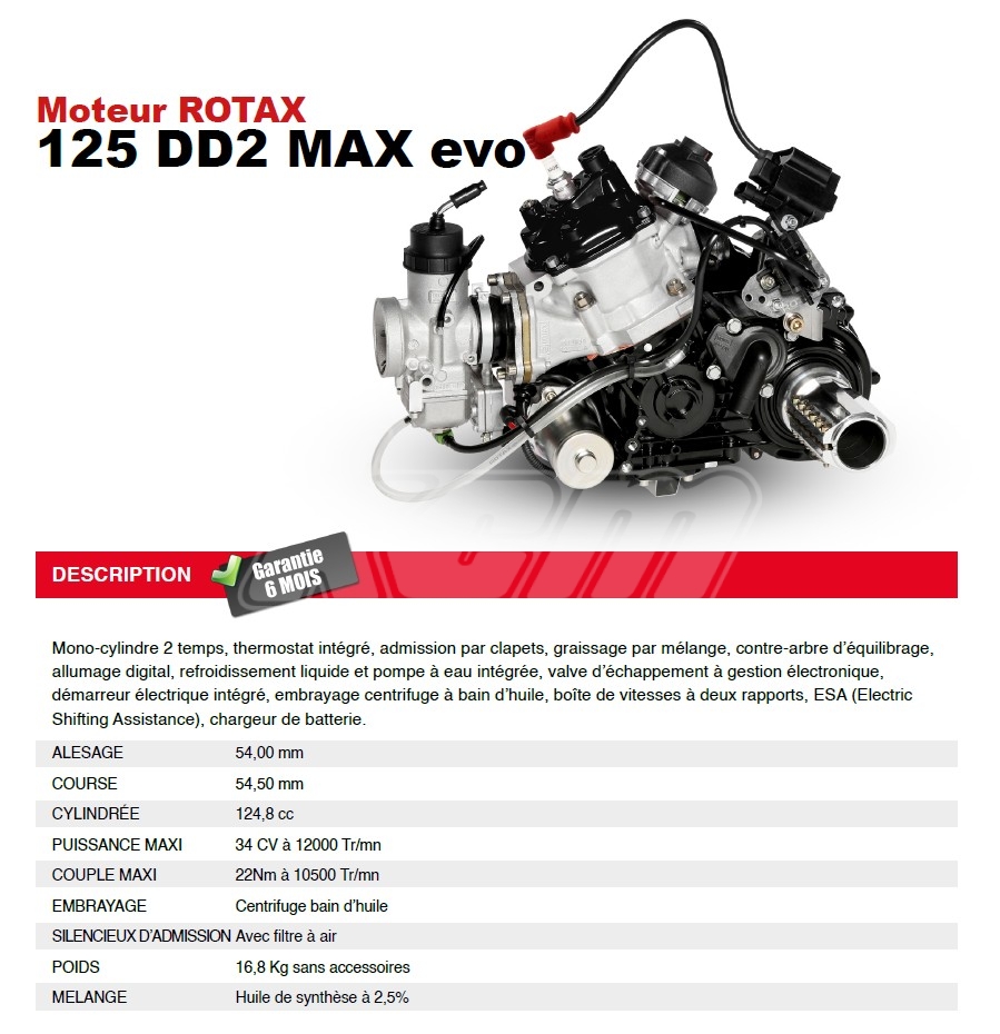DESCRIPTION : Mono-cylindre, 2 temps, admission par clapets, graissage par mélange, contre-arbre d’équilibrage, allumage digital, refroidissement liquide et pompe à eau intégrée, valve d’échappement à gestion électronique, démarreur électrique intégré, embrayage centrifuge à sec, boîte de vitesses à deux rapports, ESA (Electric Shifting Assistance), culasse noire et plaque d’identification numérotée.